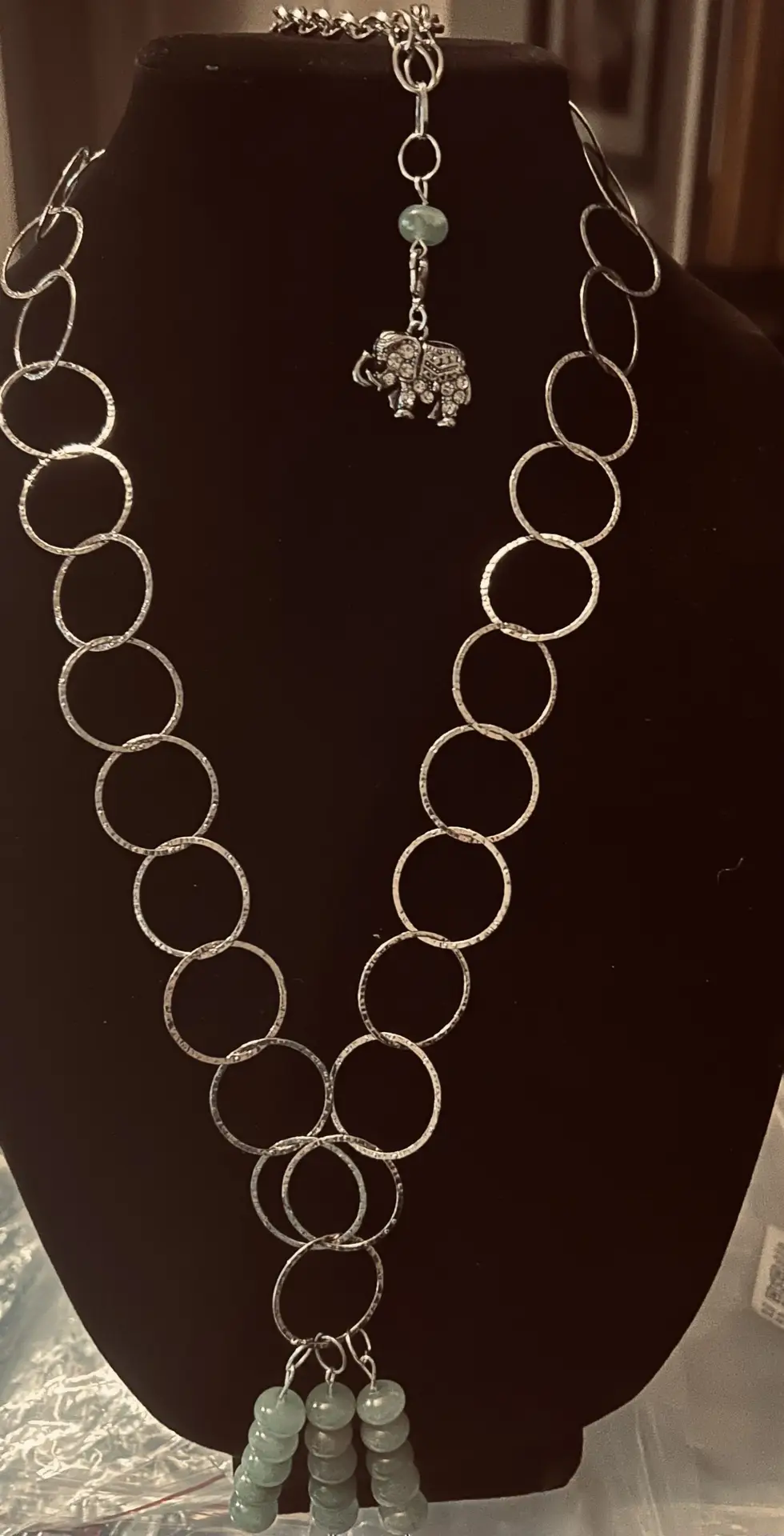 Silver tone bracelet with aventurine elephant gem pendant beautiful when paired with Aventurine Circle Necklace.