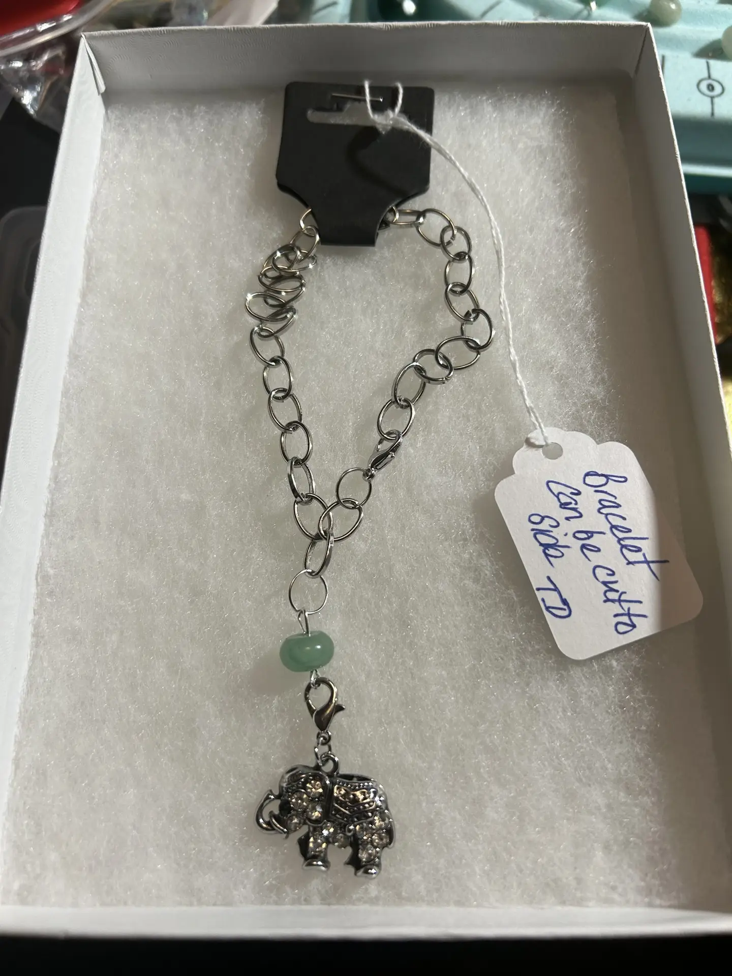+ Free ShippingSilver tone bracelet with aventurine elephant gem pendant.